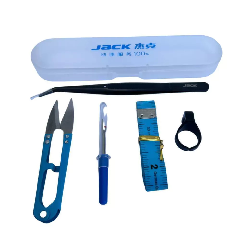 Contém: 01 tesoura de arremate em aço carbono , 01 pinça de precisão black , 01 abridor de caseados , 01 dedal para retirada de fiapos , 01 fita métrica JACK , 01 lindo estojo para guardar esses itens .